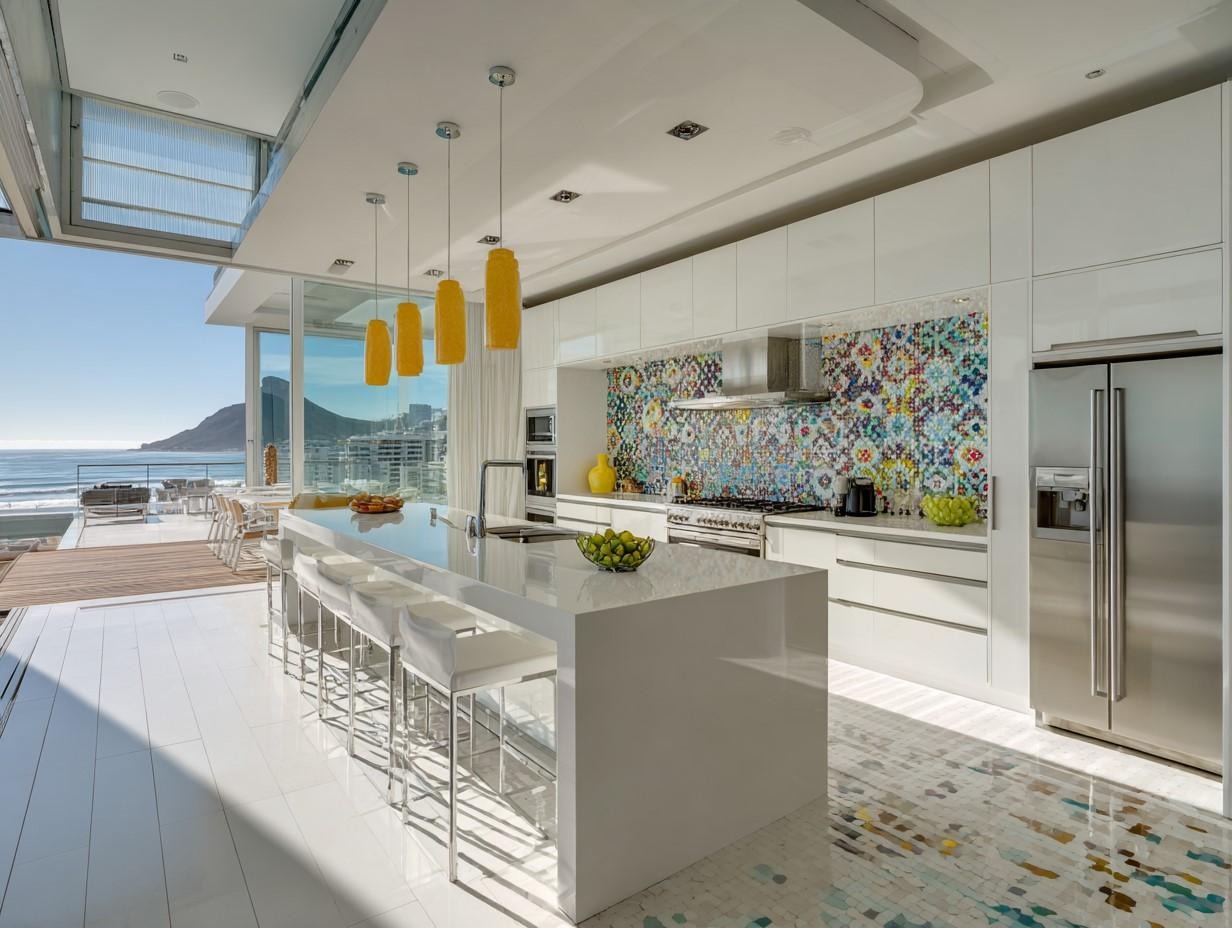 • Coastal Comfort: White shaker cabinets, sea-blue tiles, and woven pendant lights.